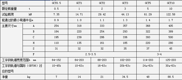 手推單軌小車GCT型0.5T-10T: GCT型手推單軌小車工作安全,維護簡易,結(jié)構(gòu)緊湊,安裝尺寸小,車輪輪緣間距可按軌道寬度要求簡易調(diào)整,使用方便,車輪車輪經(jīng)過特殊設(shè)計形狀的踏面,使其能在1:6及以下的斜軌道或平軌面上行駛。