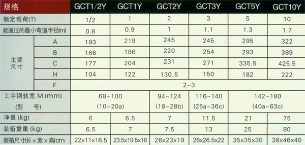 無錫太湖GCTY型系列手推單軌小車技術(shù)參數(shù):