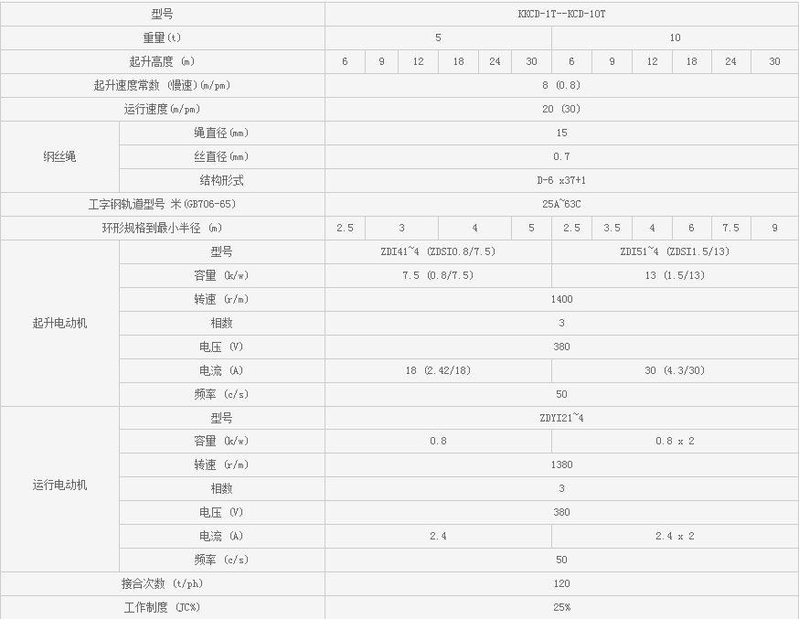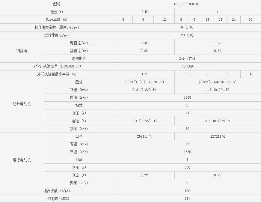 浙江凱勛KCD-1T--KCD-10T鋼絲繩電動葫蘆技術參數(shù):