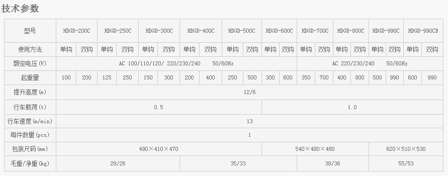浙江凱勛HDGD-200--HDGD-990電動小車式微型電動葫蘆技術參數(shù):