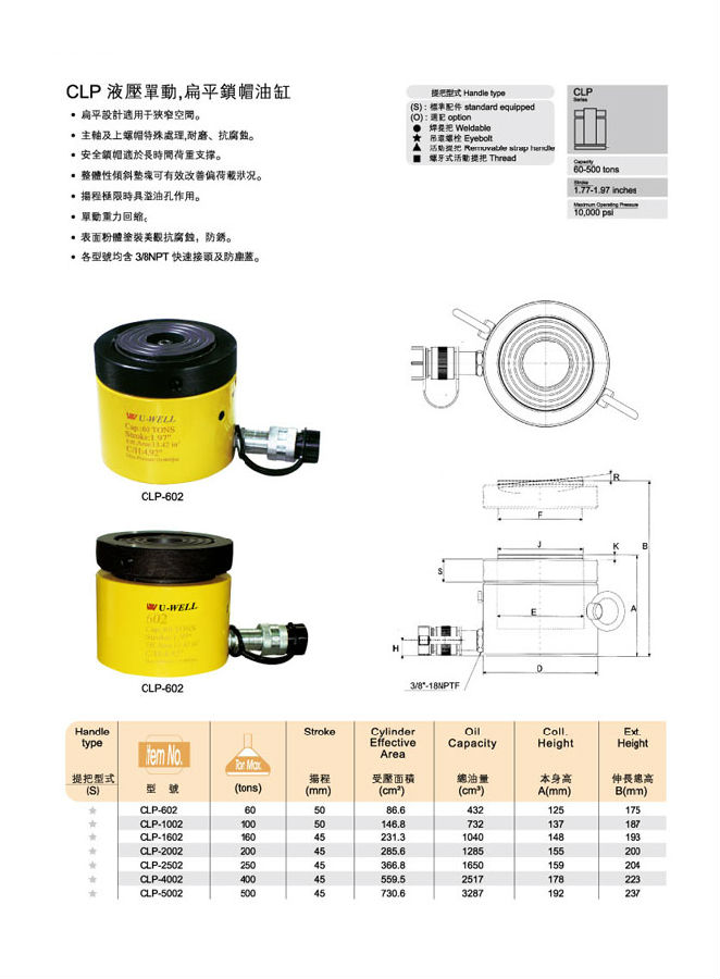 臺(tái)灣優(yōu)偉CLP液壓?jiǎn)蝿?dòng)式扁平鎖帽油缸扁平的設(shè)計(jì)理念,使其能夠勝任狹窄的空間,在狹窄的環(huán)境下也能夠正常的作業(yè)。產(chǎn)品的回縮形式為單動(dòng)重力回縮;整體性傾斜墊塊有效的改善了偏荷載的狀況;其安全鎖帽的設(shè)計(jì),使產(chǎn)品能夠進(jìn)行長(zhǎng)時(shí)間的荷載支撐作業(yè);主軸與螺帽經(jīng)過特殊的處理,增強(qiáng)了其耐磨性與抗腐蝕性,延長(zhǎng)了產(chǎn)品的使用壽命。所有CLP系列均需穩(wěn)定表面來做舉升動(dòng)作,在沙地或泥地使用扁平鎖帽型油缸易造成使用危險(xiǎn)。